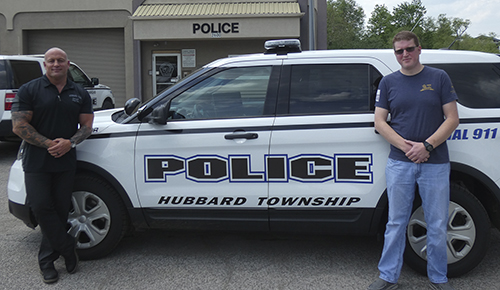 Staff Photo / Bob Coupland Hubbard Township Police Chief Greg Tarr, left, and Fraternal Order of Police Constable Chris Gifford stand outside the fire department of ... -