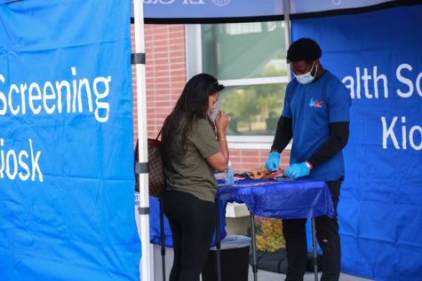 A woman takes a COVID-19 nasal swab test in front of a World Back to Work staff member at El Camino College on Monday, August 30. ... -